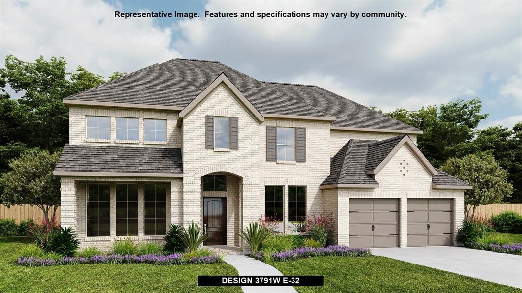 Perry Homes New Construction! Curved staircase highlights two-story entry. Home office with French doors and formal dining room set at entry. Two-story family room with wall of windows and corner wood mantel fireplace opens to kitchen and morning area. Kitchen features walk-in pantry and island with built-in seating space. First-floor primary suite with curved wall of windows. Dual vanities, garden tub, separate glass-enclosed shower and two walk-in closets in primary bath. First-floor guest suite offers private bath. A game room, media room and three secondary bedrooms are upstairs. Extended covered backyard patio. Three-car garage.