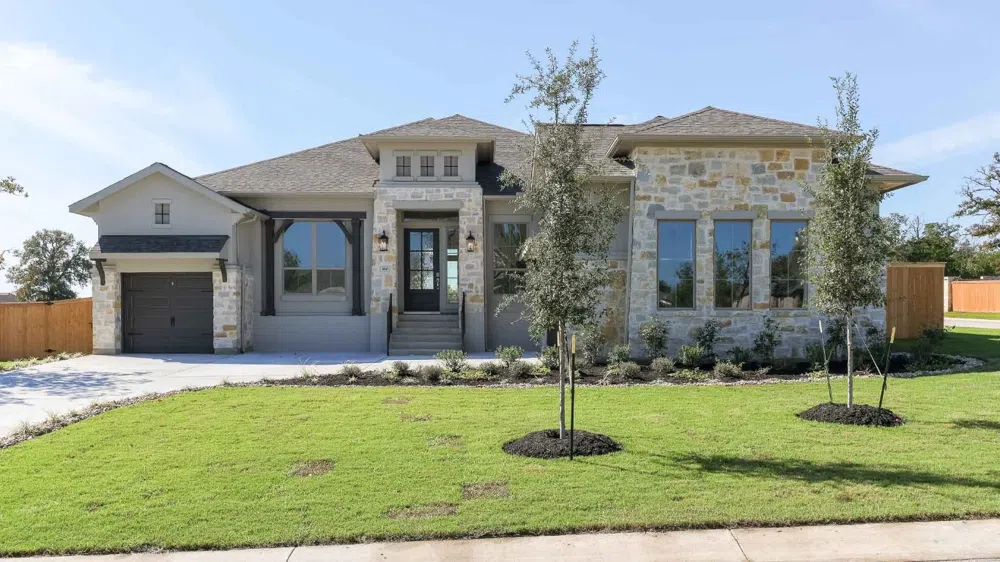 New Homes in Amenity Rich, Gated Section of The Colony. Home office and formal dining room set at entry with rotunda ceiling. Family room with wall of windows and corner fireplace flows into open kitchen and morning area. Kitchen features walk-in pantry, Butler's pantry and island with built-in seating space. Game room just off morning area. Primary bedroom features coffered ceiling and wall of windows. Primary bath features dual vanity, garden tub, separate glass-enclosed shower and oversized walk-in closet. Guest suite offers private bath. High ceilings and abundant natural light add to this generous four-bedroom design. Covered backyard patio. Mud room. Three-car split garage.