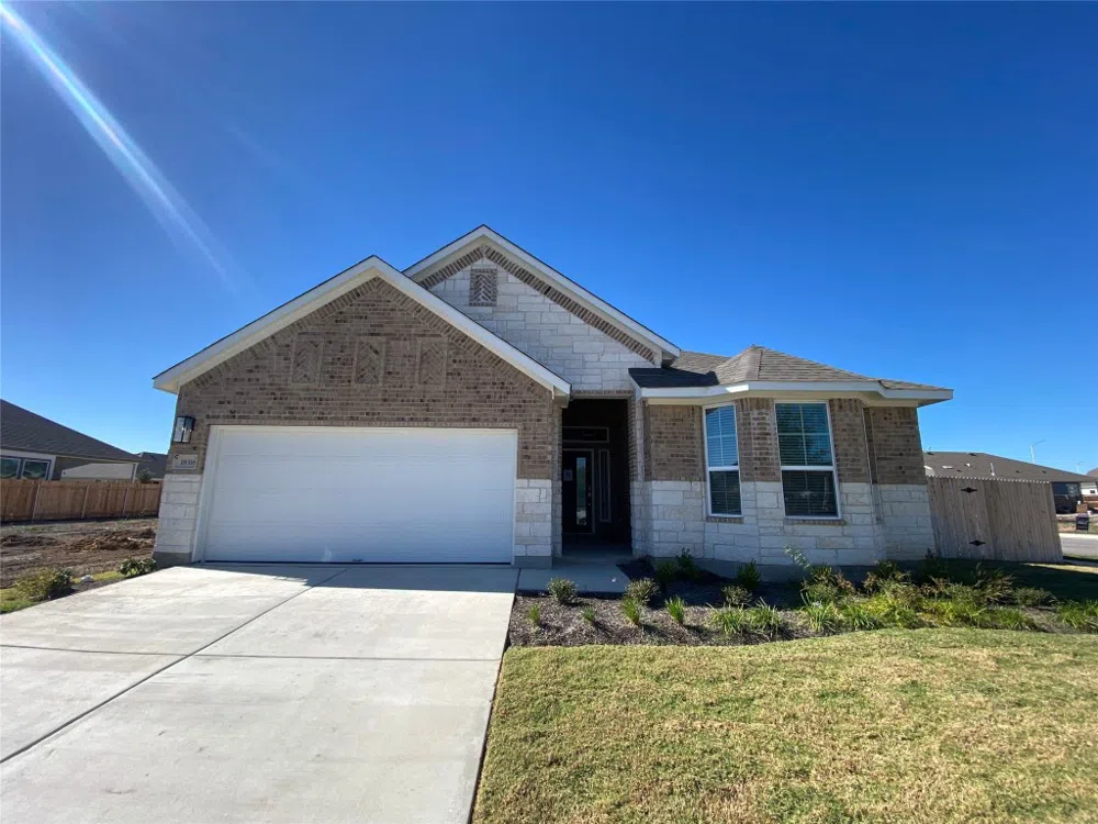 Ready fall 2023. This brick and white Texas limestone home is on a deep corner homesite and is absolutely gorgeous inside and out. Upon entry the beautiful luxury vinyl plank flooring stretches throughout the common areas of the home. There is a large flex space for working from home, or as a game room, or enjoying a movie with family and friends. The kitchen island is large enough to seat six, and is open to the dining room and family room which has a 16' vaulted ceiling. The primary bedroom comes with a coffered ceiling detail, and the large primary bath has a huge walk-in shower and a doorway that opens to the utility room. This home is a "must see" on your list. Don't forget to ask about our current incentives!