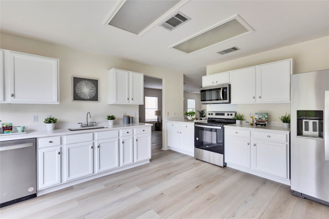 Owner spared no expense with these upgrades! Brand New roof with fully transferrable labor/material warranty. Brand New Whirlpool Kitchen Appliances including Huge 28 cubic foot refrigerator. Brand New 9-inch wide floating plank flooring, 20 mil commercial grade wear layer. Brand New beautiful quartz countertops with stylish gray veining. Completely refinished cabinets in stunning bright white. Home located in ideal South Austin location. Beautiful neighborhood with gorgeous oak trees! Extra large living space invites you into this home. Ample window light throughout. Large, open kitchen leads to backyard which includes giant back patio. Great for barbeques and entertaining. Massive pantry with washer/dryer included inside unit. Owner's suite is huge, with double vanity bathroom sinks and spacious walk in closet. Additional bedrooms provide great space. Water heater replaced 2021. Garage includes an overhead door opener. Convenient to Southpark Meadows shopping, Target, HEB, gyms, Sprouts, post office, multiple parks plus tons of restaurants and entertainment to enjoy in the area.